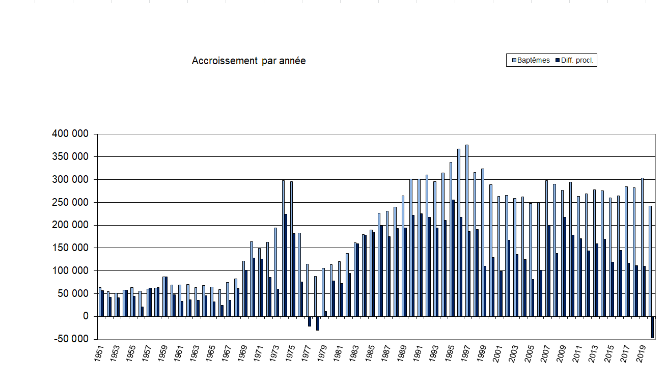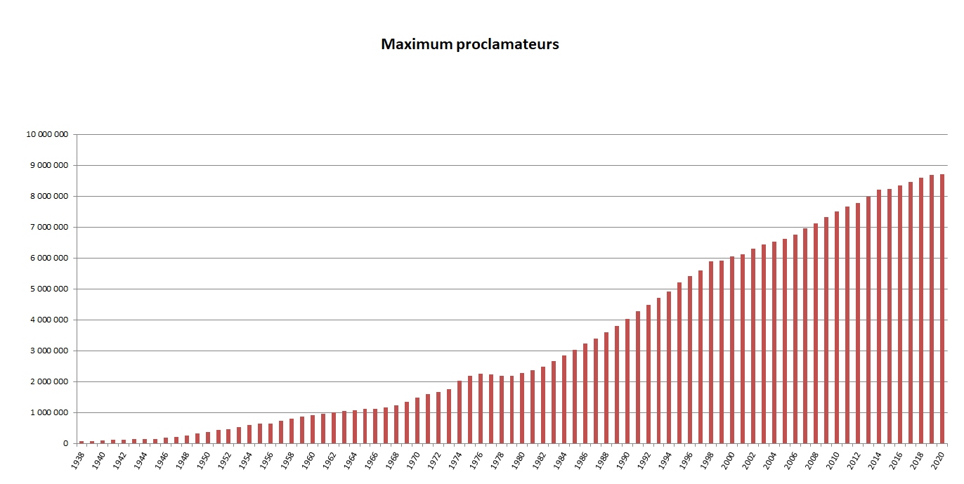 2020 est la première année depuis la crise de 1975 où l'on voit une baisse du nombre de proclamateurs. Cette situation exceptionnelle est peut-être liée à la pandémie de Covid-19.